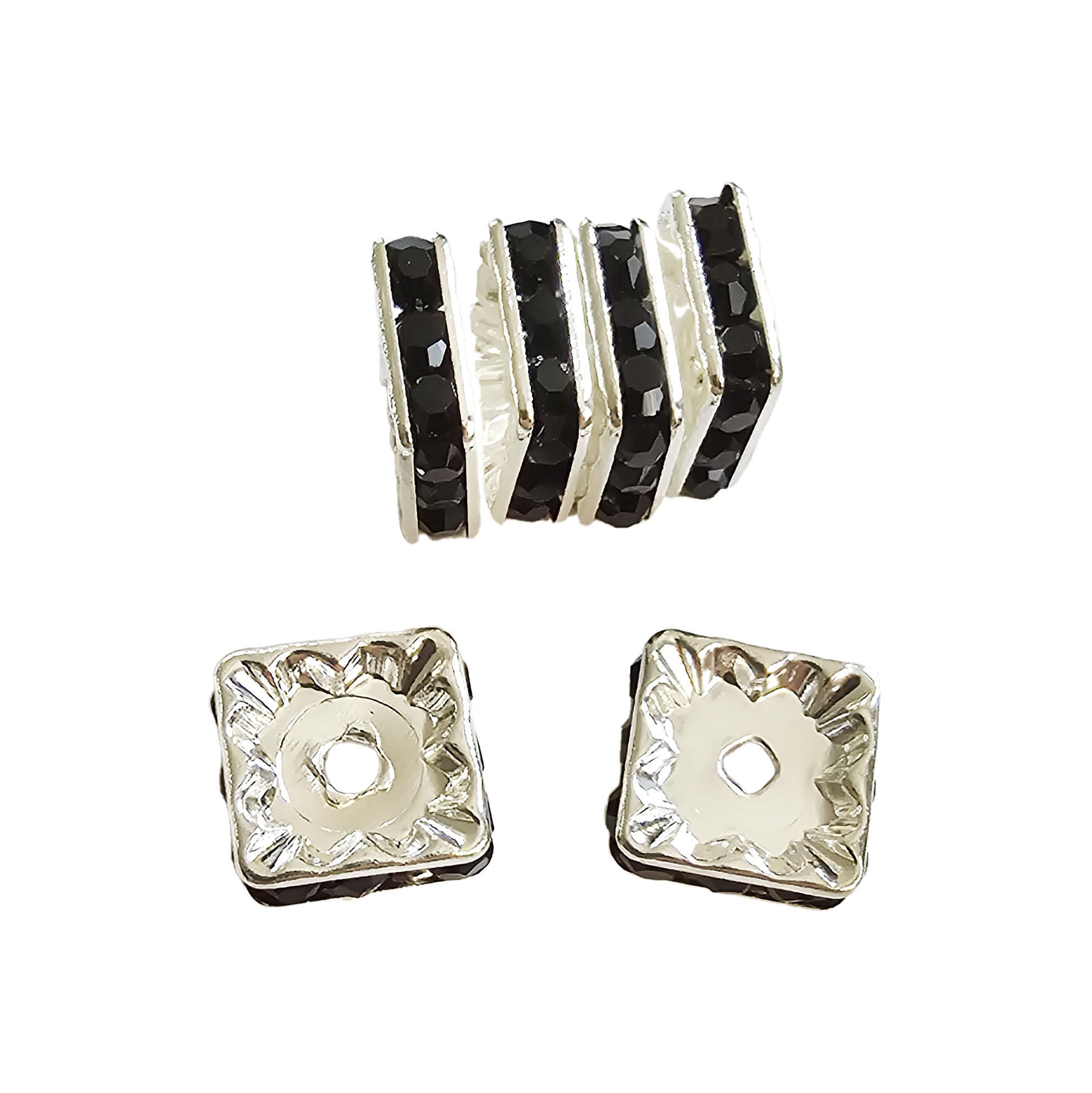 Rondel firkant forsølvet m/rhinsten sorte 10×10 mm. 10 stk.